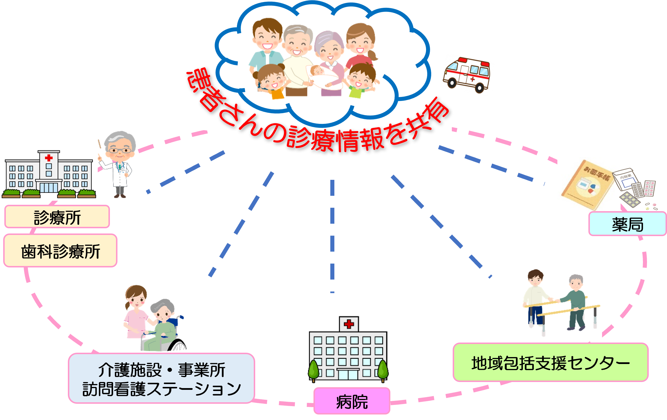 病院、診療所、薬局、介護施設などをネットワークで結び、みなさまの診療、調剤、介護に必要な情報を共有し、より良い医療に役立てることができる熊本県のしくみです。