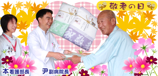 本院では、平成25年9月13日(金)に敬老の日の記念として、一般財団法人恵和会との協賛で、特製バスタオルを65歳以上の入院患者様(316名)へプレゼントしました。