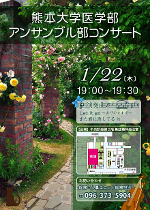 1月22日(木)19:00からから本院中央診療棟2階集団精神療法室にて熊本大学医学部アンサンブルによるコンサートを開催いたします。Let it go ~ありのままで~、また君に恋してる、その他たのしく心温まる曲目を演奏する予定です。 なお熊本大学医学部アンサンブル部コンサートは、参加費無料、事前の参加申込みは不要です。皆様のご参加をお待ちしています。 ※視聴用の席をご用意いたしますが、参加者多数の場合は立ち見をお願いする場合がございます。 |